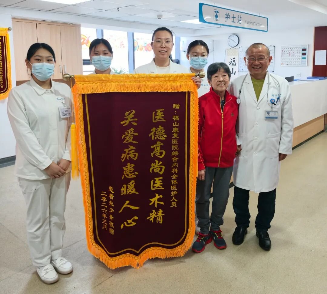 “多亏了5楼的医护人员,不仅医术好,还特别有耐心,把我照顾得特别周到,让我能安心治病、快速康复。”康复出院后,朱阿姨满心感激,连同朱大叔一起,特意定制了两面锦旗,一份致敬内科医护团队,一份赠予8楼护理长及全体护理员。