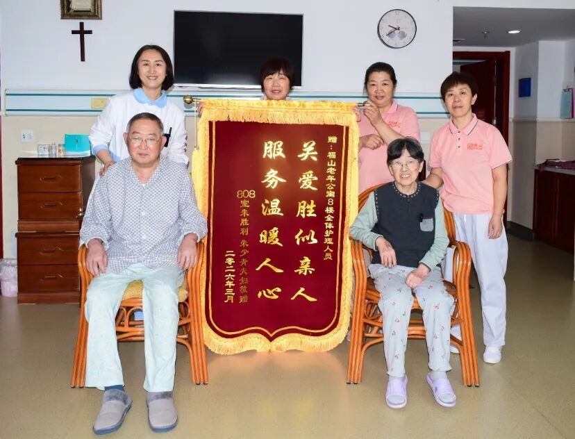锦旗轻,情意重;一句谢,一份暖。这两面锦旗,不仅是朱少青、朱胜利夫妇对福山老年公寓服务的高度认可,更是对全体工作人员的莫大鼓励与鞭策。从日常照料的点滴细节,到生病时的悉心守护;从政策对接的积极协助,到心理上的温暖陪伴——福山老年公寓始终将专业的照护与真挚的关爱融入每一个平凡日子。医养无缝衔接、护理员随叫随到……这些实实在在的举措,让“老有所养”变得具体而温暖。